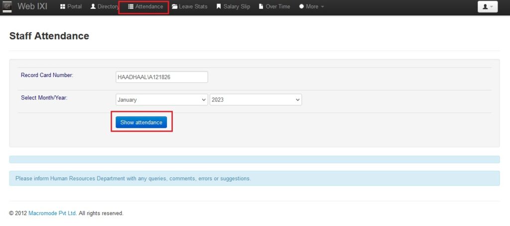 ● Attendance ބަޔަށް ގޮސް، އަހަރާ މަސް ނެގުމަށްފަހު Show attendance އަށް ފިތާލާ