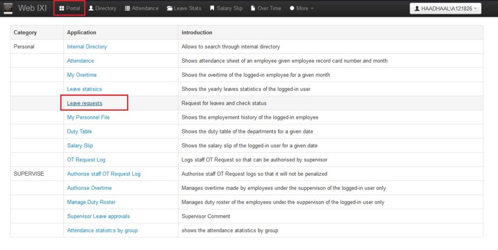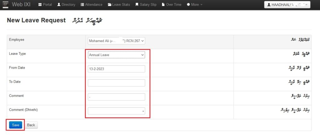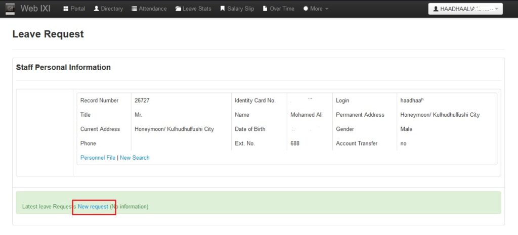 ● މަތީގައިވާ Portal އިން Leave Requests ނެގުމަށްފަހު New Request އަށް ފިތާލާ.