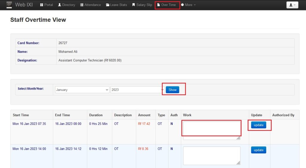 ● މަތީގައިވާ Over Time އަށް ނެގުމަށްފަހު އަހަރާއި މަސް ނަގާފައި Show އަށް ފިތާލާ. އިތުރުގަޑި ހަދާފައިވާ ދުވަސްތަކާއި ގަޑިތައް ޗެކްކުރުމަށްފަހު ކުރިމަސައްކަތް ލިޔެފައި Update އަށް ފިތާލާ
