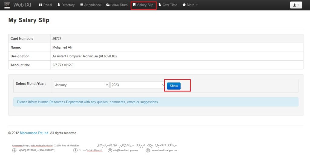 ● މަތީގައިވާ Salary Slip އަށް ފިތާލުމަށްފަހު އަހަރާއި މަސް ނަގާފައި Show އަށް ފިތާލާ